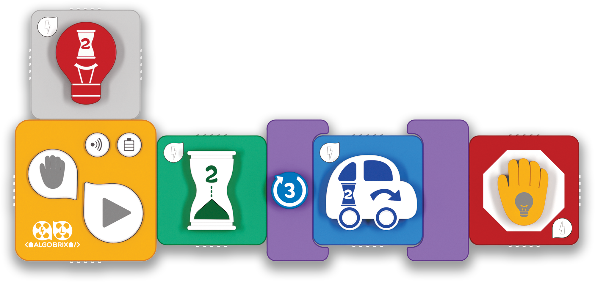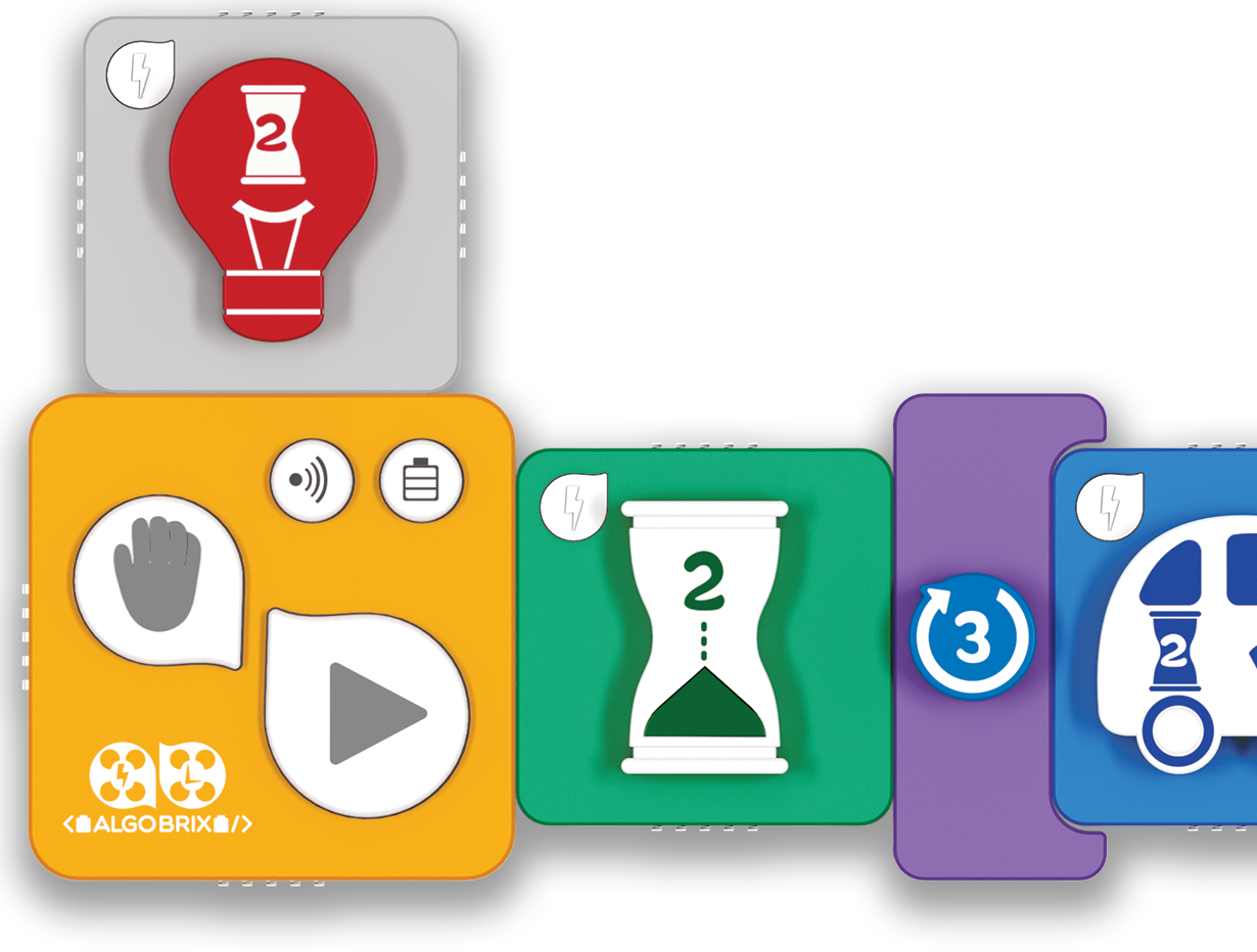 With the tangible coding language of Algobrix®, students begin by constructing a building block model, then create various lines of code using function & Parameter blocks. Finally, by pressing the Play block, the robot will perform the coding sequence.
